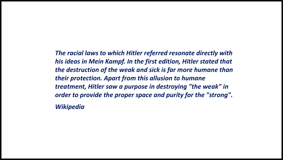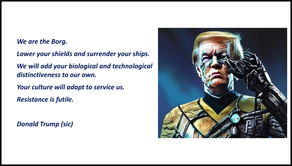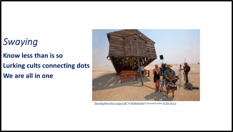 7. As featured in Chapter 10 (Way Too Little Information), Shared Underlying Basic Assumptions (SUBAs) are just made-up conceptual constructs to squeeze down our universe’s overwhelming complexity into something that our little minds can comprehend. We gotta have em. They make the world work for us but are easily manipulated to good and bad effects. It seems that consciously fausting unconscious SUBAs on us is the one of the reasons that Murdock owns Fox News and the Wall Street Journal, Besos owns The Washington Post, and Elon bought Twitter. Milosevicking (Chapter 10: Way Too Little Information) works: the strategic molding of shared beliefs and assumptions has proven effective throughout history. Once swallowed, SUBAs dominate the converts but often become mightier than their enablers. That apparently happened in prewar Germany after Hitler came to power - too late for the Murdock, Besos, and Musk of that era to do anything about it. Most of us aren’t even aware that we are possessed by SUBAs, some of which are Frankensteins. SUBAs are powerful subliminal forces that we just can’t acknowledge….suppressed for our own good? Bad Robot.