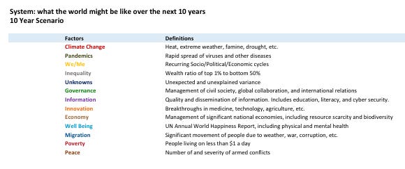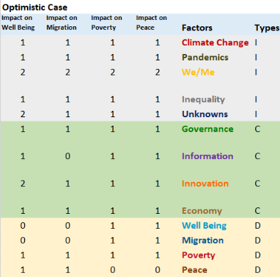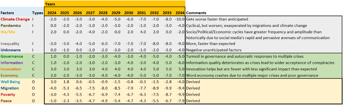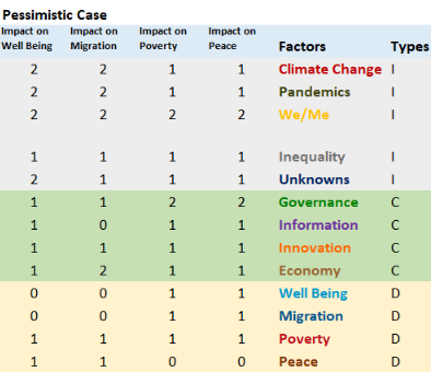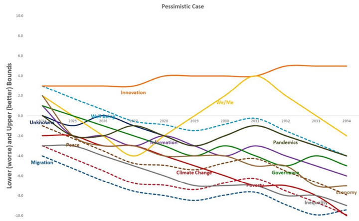 Pessimistic Summary: Well Being, Migration, Poverty, and Peace all worsen significantly, driven by climate change, a deteriorating world economy, and poor governance. We/Me cycles exacerbate the trends and conditions. Pandemics are more frequent due to Climate Change and poor Governance. Misinformation and Inequality worsen. Unknown and unexplained variance add to deterioration.
