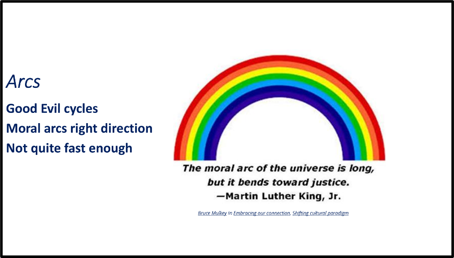 4. As discussed in Chapter 17 (Cycling Continuously), human nature is predisposed toward We/Me economic/political/social cycles. In addition to having Brut and Coop residing and battling in our genome, this cycling occurs partly because people are prone to view the present critically, while idealizing both the past and the future. Que sera sera. This permanent ongoing disappointment fuels the We/Me Cycle. We now appear to be in the “Me” part of this never-ending cycle (“Me Trump” - adapted from apelike dominance utterances and chest beating). Although STAs aren’t aware of it, the unseen subtle force of the cresting Me cycle explains why they are STAs. Tell them that and they’ll deny it. Tell my side that the way we think is perhaps beyond our control; we’ll deny it. And of course, many intellectuals will state that there are no more cycles – which is itself cyclical.