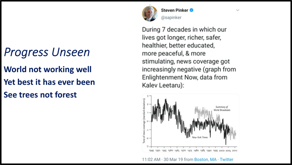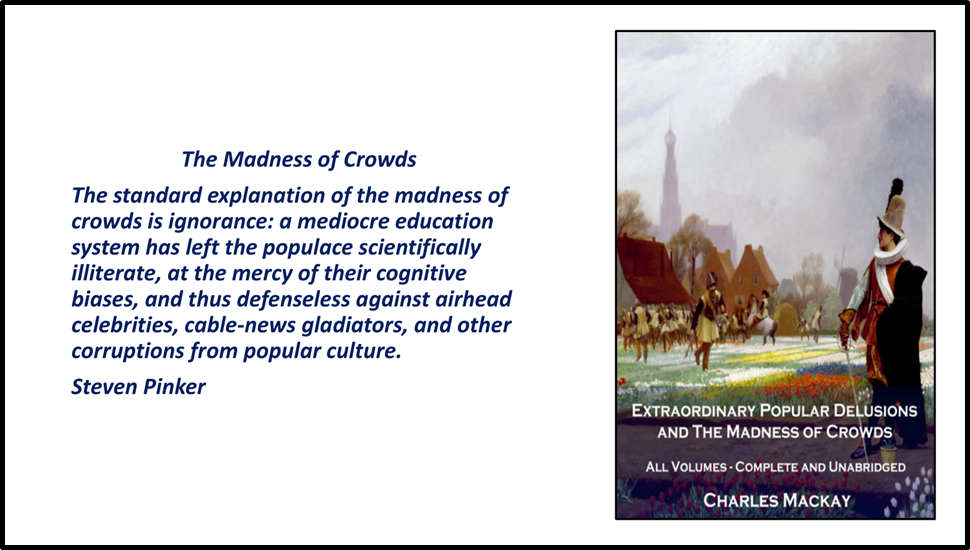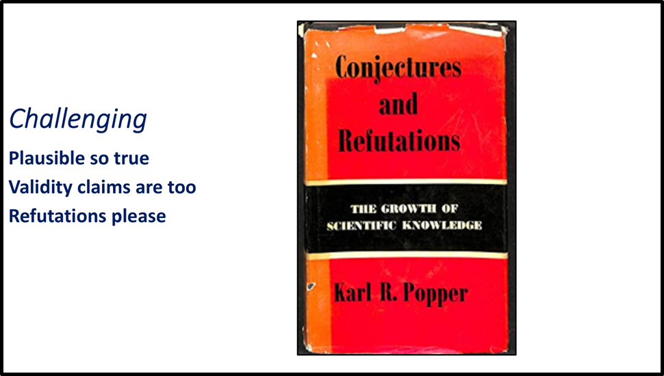 2. As mentioned in Chapter 15 (Arcing Acceptably), Bertrand Russell famously remarked that Copernicus’s most profound contribution wasn’t the heliocentric model of the solar system. Copernicus’s most profound contribution was the revolutionary idea that long-held beliefs, endorsed by society’s most respected elites, could both be wrong. And as Kuhn asserted (Chapter 10: Way Too Little Information): even science is biased by Shared Basic Underlying Assumptions (Subas). For me, Subas make up the core of the case for understanding smart Trump advocates (STAs). One of their Subas might be “we are protecting and restoring our way of life from pinko, do-gooders”. The suba is validated and Milosevicked by State Media, aka Fox News (See Chapter 10: Way Too Little Information). On the other hand, maybe it is me and my tribe’s Subas that are not resonating with enough voters. One of our Subas is: “preserving the principles and processes of The Enlightment which has brought so much good to so many”. This one is validated by Stephen Pinker and other Harvard elites, as well as Noam Chomsky at MIT, among others. After all the reading, research, and reflection, I don’t believe that wise people from either side can possibly be certain of societal truths – we are all just conjecturers as Karl Popper suggested in Conjectures and Refutations, his book on the philosophy of science.