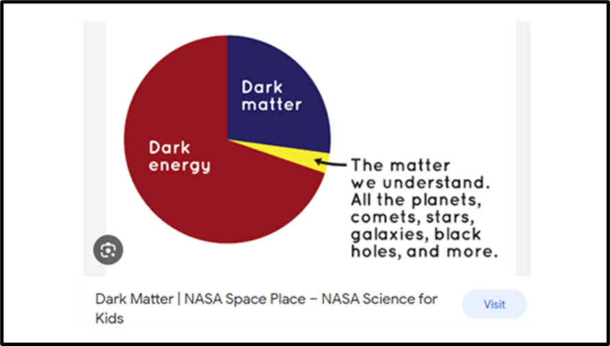 So…at the big bang birth, I created dark matter and dark energy. These unseen, unknown forces make up 95% of my being. They remain to you a mystery, forming the bedrock of uncertainty, teasing you with reality riddles.