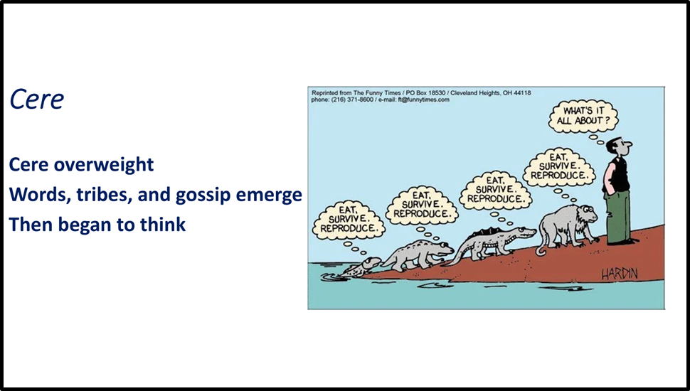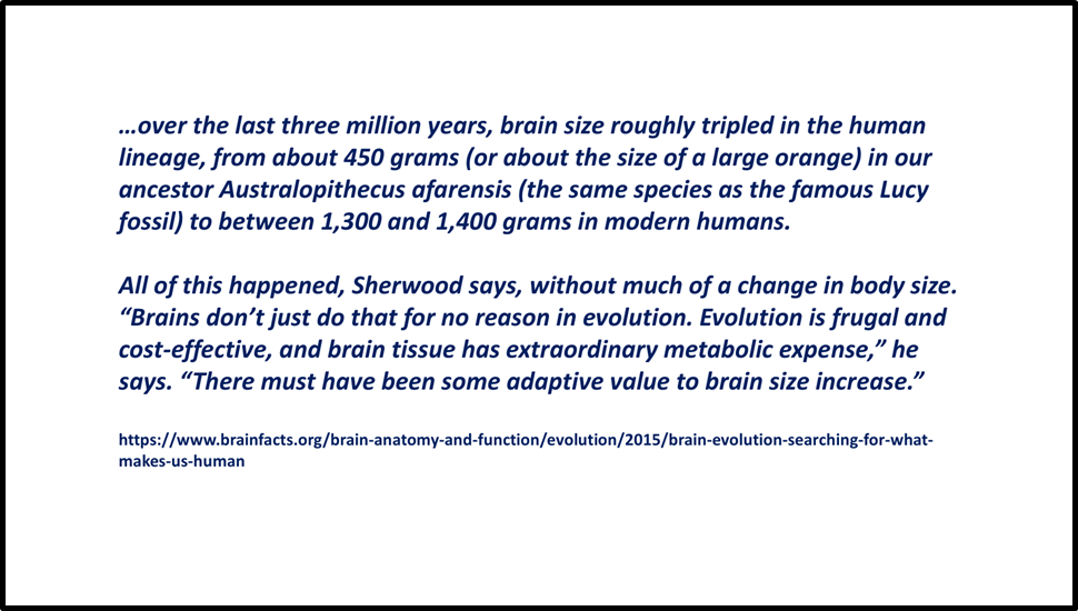 Natural Selection kept evolving a bigger brain which fostered communication and cooperation, or vice versa. The better we did both, the more likely our tribe survived: Survival of the Fittest Tribes.