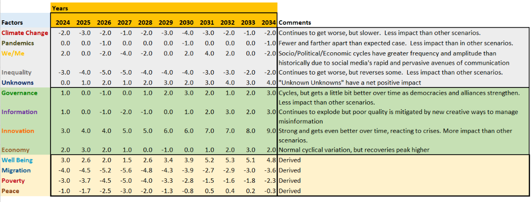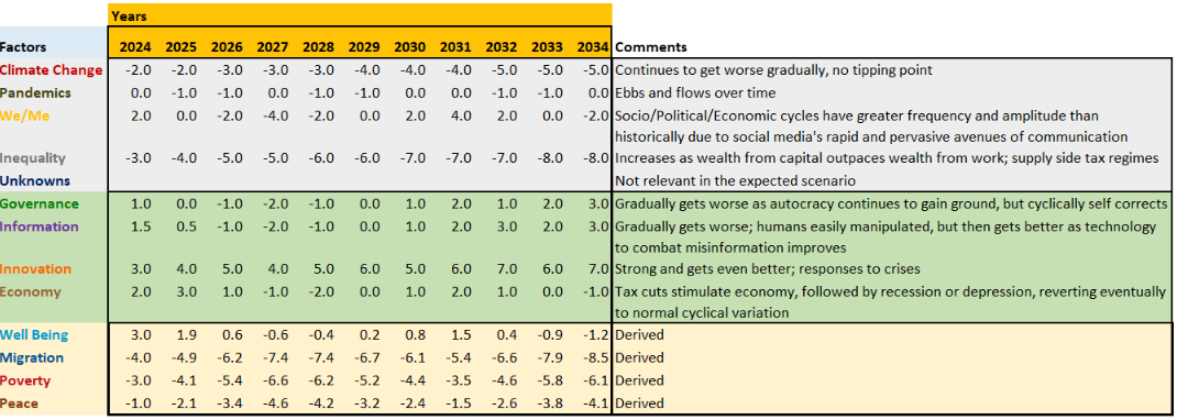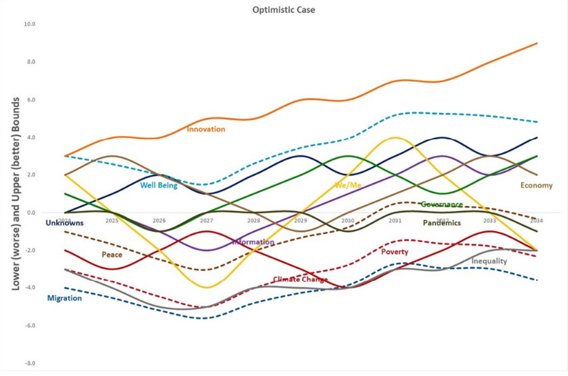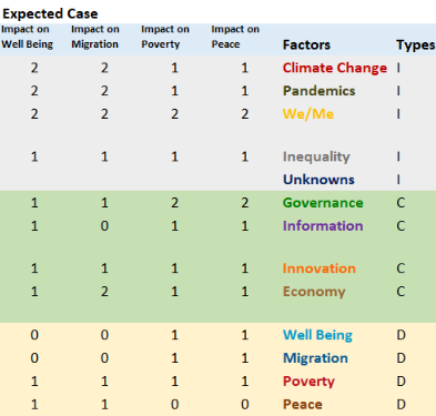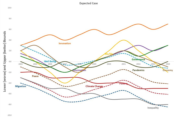 Expected Summary: Well Being, Migration, Poverty, and Peace all worsen but not dramatically. Climate change and inequality drive the deterioration but are offset somewhat by innovation, improved information, and a stable world economy. The We/Me cycle increases in amplitude and frequency due to social media while Governance and Pandemics follow historical cyclicality.