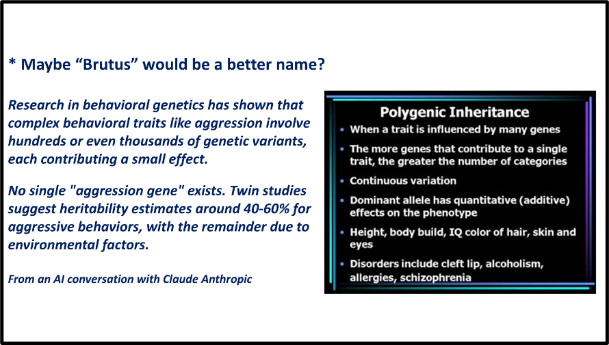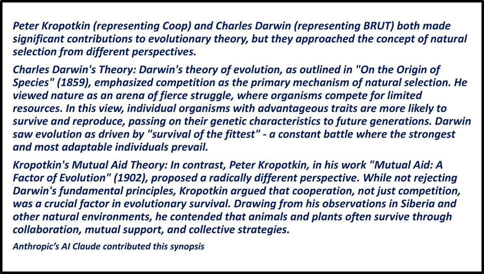 1. I think part of the answer is genetics. As discussed in Chapter 6 (Mean Machines) and Chapter 7 (Team Machines), it's the age-old tug-of-war between Brut and Coop—those evolutionary forces wired into our DNA, still battling it out after millions of years. Even STAs (Smart Trump Advocates) admit Trump is a brute. Biden, on the other hand, may have been so considerate, planned, and measured that voters’ Brut genes kicked in, reactively swinging the pendulum back toward the mean mean. As the Cherokee might say: Trump’s election indicates that we are currently feeding our Brut side. But Brut’s incarnation will go too far and eventually we’ll shift back toward our Coop side. These internal struggles create societal cycles, as outlined in Chapter 17 (Cycling Continuously). The tragic twist? Coop never wins forever. Our genetic design won’t allow it.