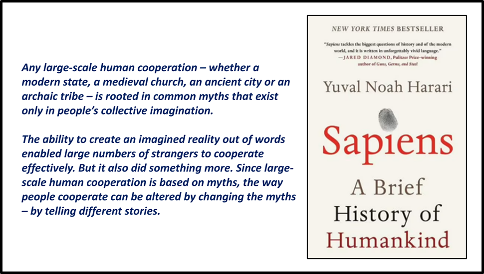 o Enabled by both brutal and cooperative human traits, sophisticated communication, and social binding Subas (propaganda, advertising, and leadership work).