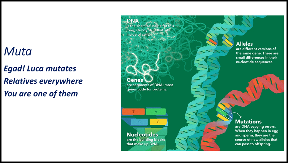 Just 3.8 billion years ago, due to cloning glitches beyond Luca’s control, we mutants materialized. We were more than just Many Me's and survived in more interesting niches.