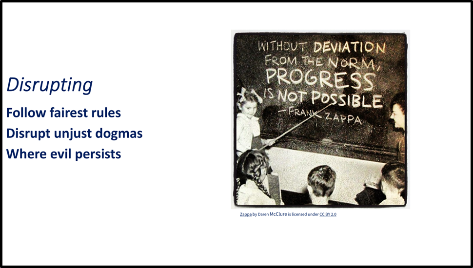 And, as Frank Zappa, another famous philosopher, wrote on the blackboard, “Without deviation from the norm, progress is not possible.” No disagreement here, just wishing for progressive disruptions that move us forward, rather than regressive ones that move us back.