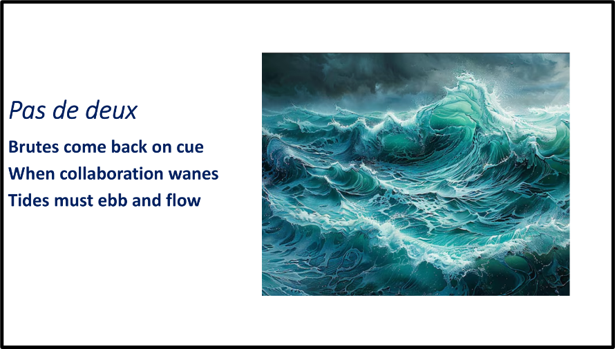 o Fueling the Subas is our evolutionarily gifted duality: deep seated brutal as well as cooperative nature (creates cycles, as cultures invariably stray too far from the balance between our two fundamental natures and regress toward the mean – a salute to Aristotle for this mean concept).
