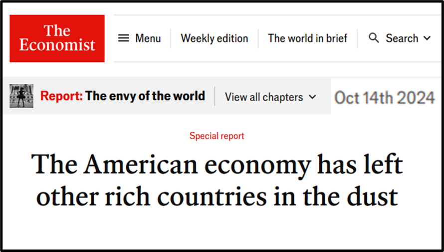 8. As inferred in Chapter 15 (Arcing Acceptably) – we need disruptions! Maybe disruptions are what STAs want most, especially since their SUBA tells them loudly and often that America is a terrible place and needs a change. Ironically, The Economist notes that from 2020-2024 the US economy completely dominated the G7 field in terms of growth, jobs, and reduced inflation, even though the STA SUBA says otherwise. This Aristotelian like quote seems appropriate: “Comparison is the root of all significance.” Furthermore, it looks like Elon is on track to disrupt the outperforming US economy in a Twitter like fashion.
